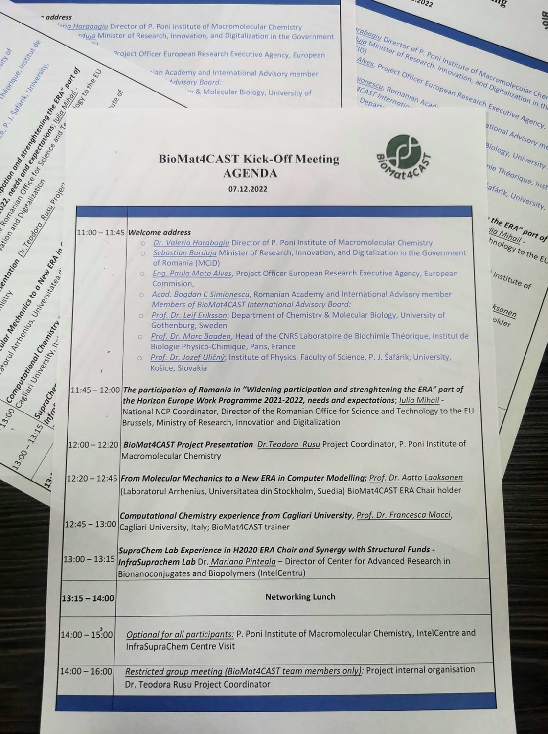 On 07.12.2022, at 11.00, the official launch of the Horizon Europe project of the ERA Chair type: BioMat4CAST - Petru Poni Institute of Macromolecular Chemistry - Multi-Scale In Silico Laboratory For Complex and Smart Biomaterials took place within the Institute of Macromolecular Chemistry "Petru Poni" (ICMPP) - Advanced Research Center for Bionanoconjugates and Biopolymers (IntelCentru), Iasi.
