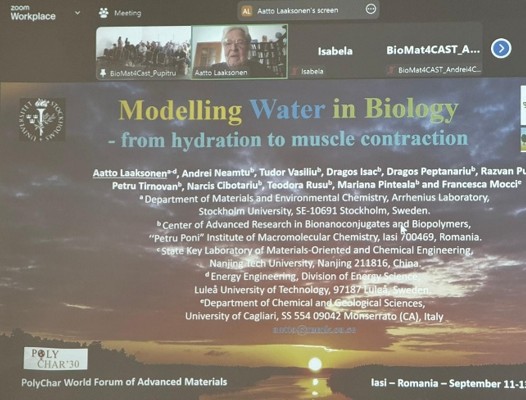 10. Modelling water in biology, A. Laaksonen, A. Neamtu, T. Vasiliu, D. Isac, D. Peptanariu, R. Puf, P. Tirnovan, N. Cibotariu, T. Rusu, M. Pinteala, F. Mocci, International Conference PolyChar World Forum on Advanced Materials 30 th Edition at BioMat4CAST Parallel Session within PolyChar: From Molecules to Complex Systems with Multiscale Modelling, September 11 – 13 2024, Iasi, Romania (plenary presentation).