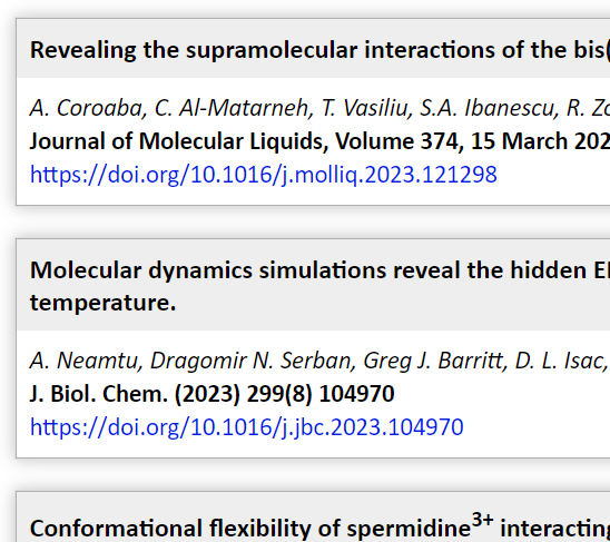 15. “Investigating the influence of polyamines on G-Quadruplex structures: Insights from Molecular Dynamics”, Authors: Razvan Puf, Narcis Cibotariu, Sergiy Perepelytsya, Mariana Pinteala, Aatto Laaksonen, Tudor Vasiliu, Francesca Mocci, Event: 1st WG2 Virtual Meeting of the COST COSY Action “From Quantum to Classical Dynamics of Isolated Molecules and 3D Materials”, 6th of February 2024