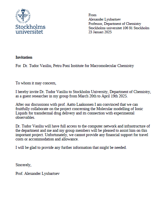 Between March 20 and April 19, 2025, Dr. Tudor Vasiliu and PhD student Razvan Puf conducted a one-month scientific stage at Stockholm University in the group of Professor Alexander Lyubartsev. The main objective of this stay was to learn and apply the MagiC software package for bottom-up coarse-graining of molecular systems and to use it in the development of a coarse-grained (CG) model of a 12 nucleosome core particle array.