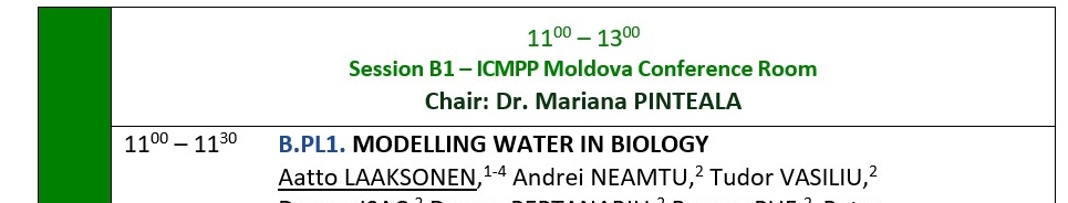 10. Modelling water in biology, A. Laaksonen, A. Neamtu, T. Vasiliu, D. Isac, D. Peptanariu, R. Puf, P. Tirnovan, N. Cibotariu, T. Rusu, M. Pinteala, F. Mocci, International Conference PolyChar World Forum on Advanced Materials 30 th Edition at BioMat4CAST Parallel Session within PolyChar: From Molecules to Complex Systems with Multiscale Modelling, September 11 – 13 2024, Iasi, Romania (plenary presentation).